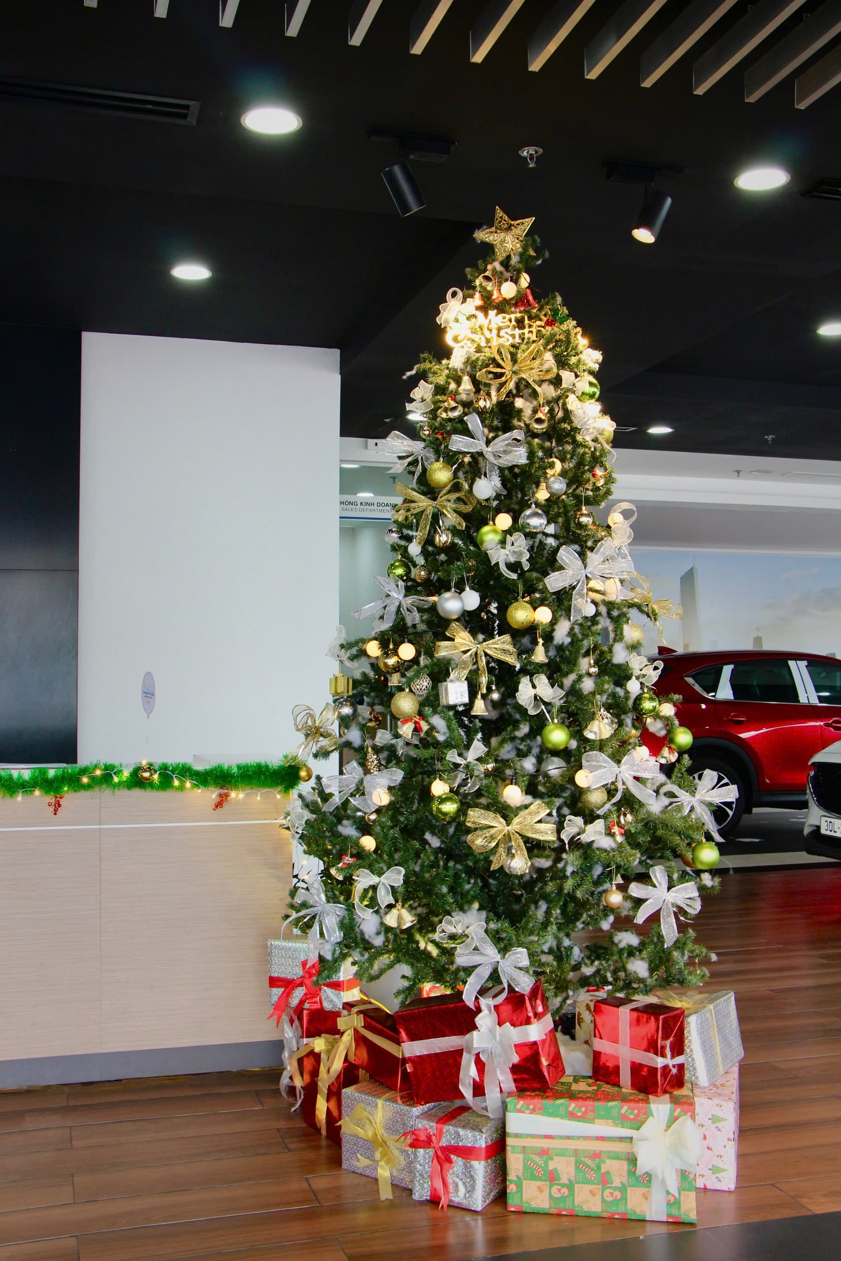 Hình ảnh cây thông lộng lẫy tại showroom Mazda Long Biên